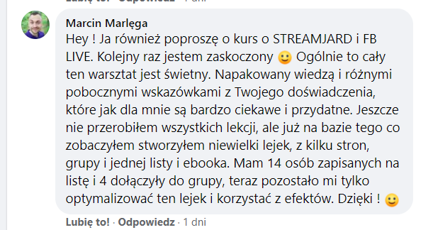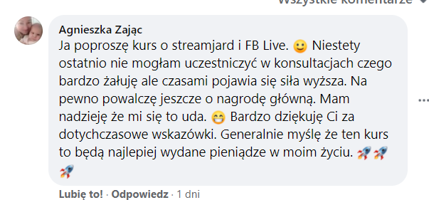 Polecam każdemu kto prowadzi działalność jakąkolwiek w Internecie. Dlatego, że wiedza Asi jest dostosowana do każdego poziomu tych właśnie osób, posiada bardzo różnorodną wiedzę. Laserowo skierowaną na rozwój osób i ich działalności pod kątem nowoczesności czyli tak jak teraz trendem jest działanie w Internecie. Warto zainteresować się tym tematem, aby swoją firmę przenieść do Internetu. Moja strona jest wynikiem naszej współpracy i owocem mich szkoleń, które dostałem od Asi. Zapraszam na moją stronę https://kodywdziecznosci.pl/ksiazka/